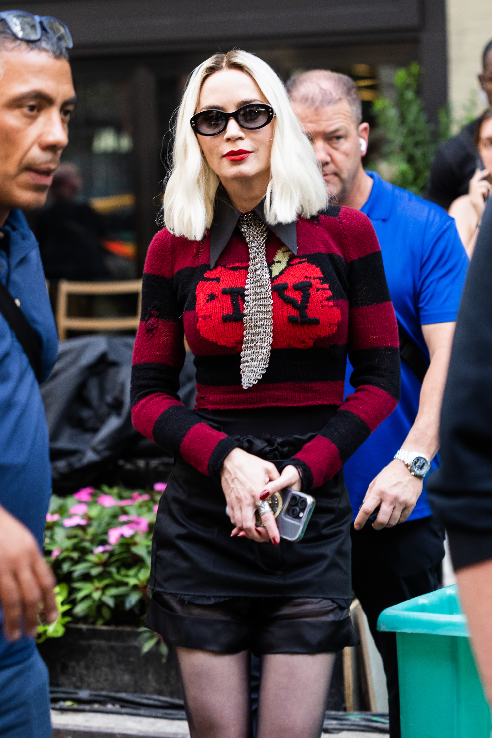 Ciudad de México, 18 de agosto de 2025 – La actriz Emily Blunt lució un suéter tejido a mano con técnica intarsia y hecho a la medida, en el set de ‘The Devil Wears Prada 2’ el pasado 14 de agosto de 2025.